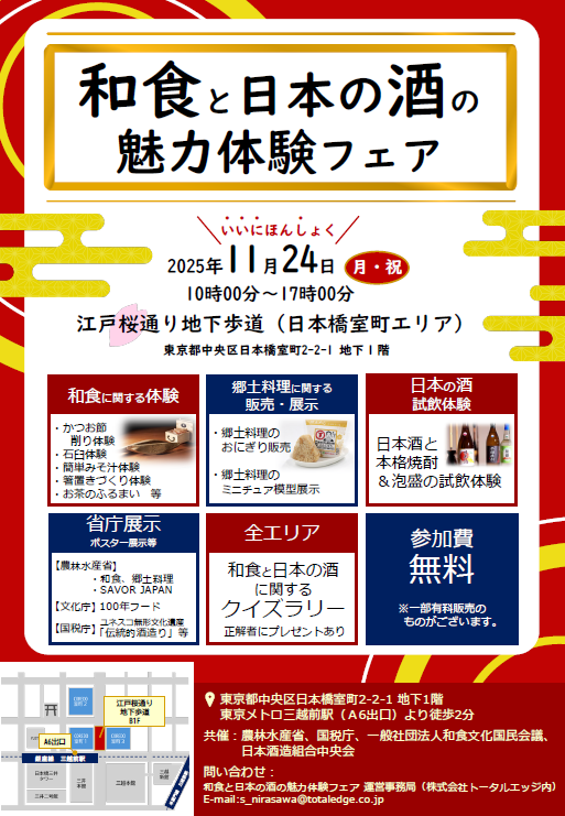 お知らせ一般向け 「伝統的酒造りに関する特設ページ公開及びPRイベントの開催について」国税庁からのお知らせ(2025.11.13) ◆「伝統的酒造り」特設ページ(日本語版)◆「伝統的酒造り」特設ページ(英語版) ◆「伝統的酒造り」PRイベント 2025年11月24日(月/祝日)開催「和食と日本の酒の魅力体験フェア」