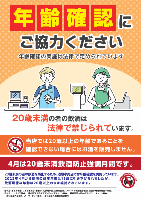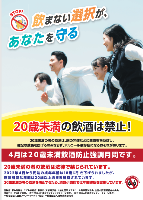 お知らせ 一般 4月は「20歳未満飲酒防止強調月間」です(2026.3.25) 詳細につきましては、こちらからご覧ください。 ◆20歳未満の者の飲酒防止啓発ポスター店舗掲示用(PDF) 官公庁等掲示用(PDF)